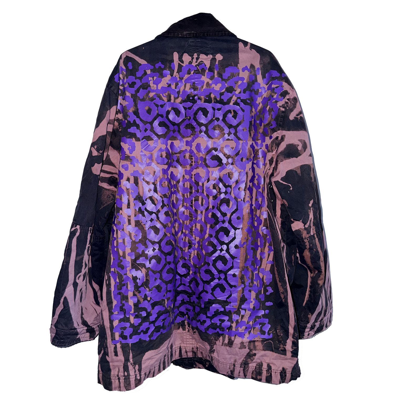 NAME: NETHER COAT SIZE: L FIT: Oversized FABRIC & MATERIALS: Cotton, nylon DESIGN DETAILS: Thermal print on front, sleeves and back, Nether portal back print, Fleur de lis sleeve print, John Cena Niko double invert chest print, Bleached and Dyed purple