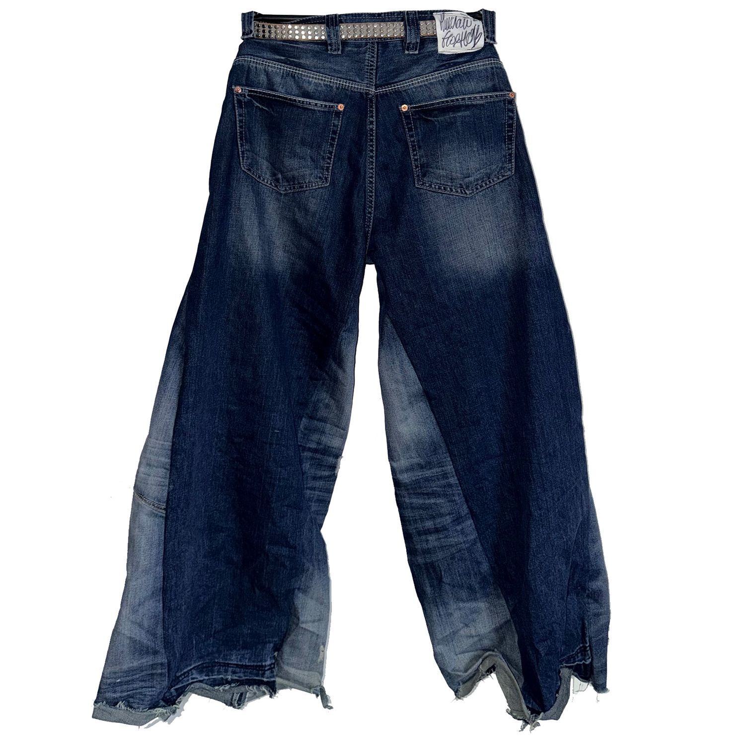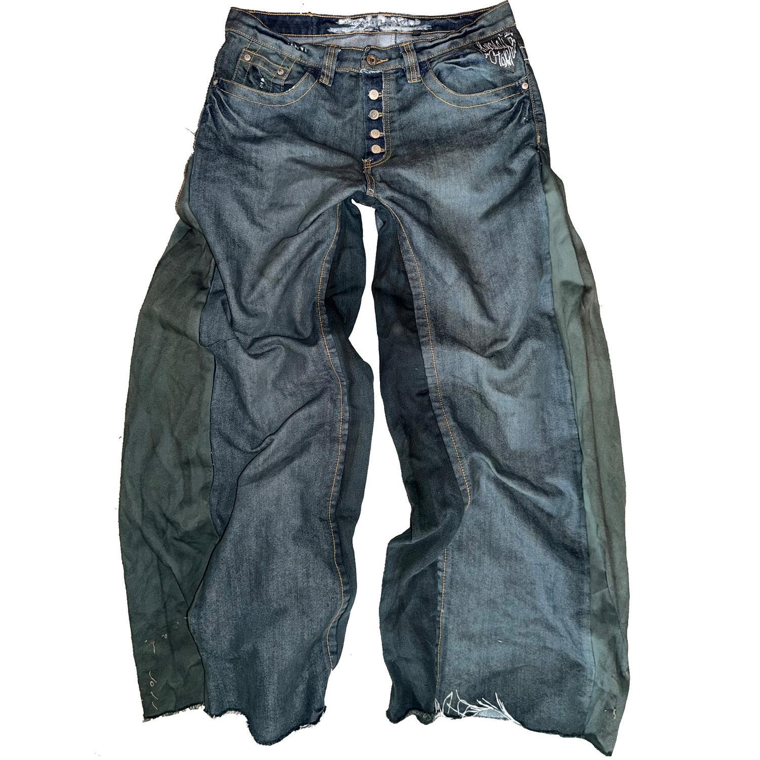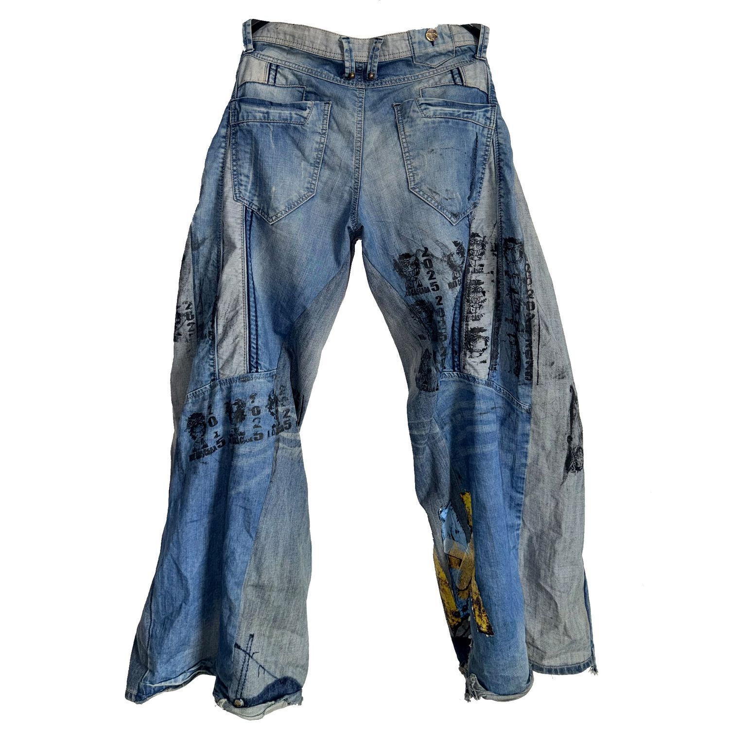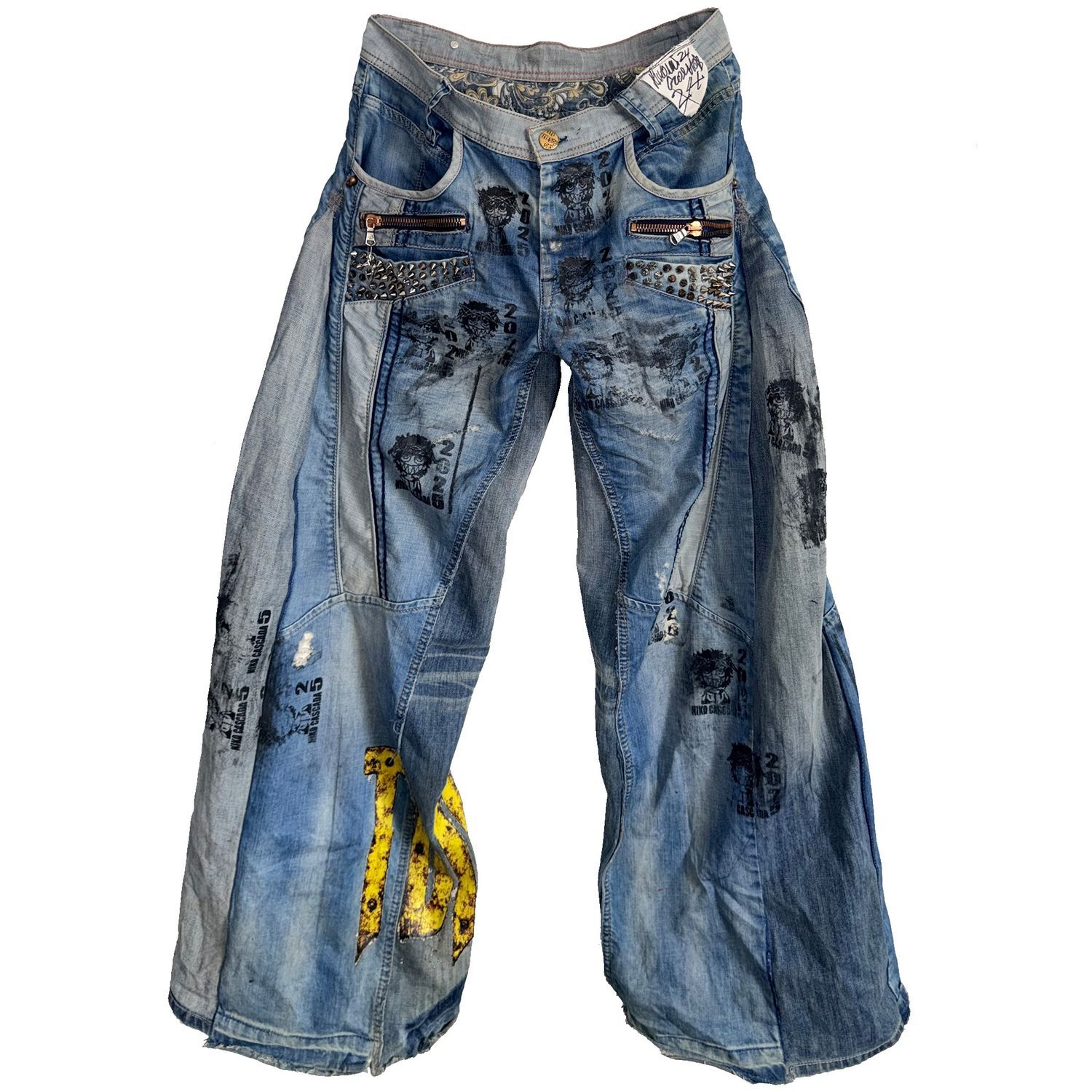 NAME: SYLVESTER'S STUDDED DENIM SIZE: 34x34 FIT: Baggy Fit FABRIC & MATERIALS: 100% COTTON DESIGN DETAILS: Steel zippers, metallic studs, Duoflare, "ТЪПАК" yellow print, Black logomania prints STORY: I robbed these jeans off of Sylvester