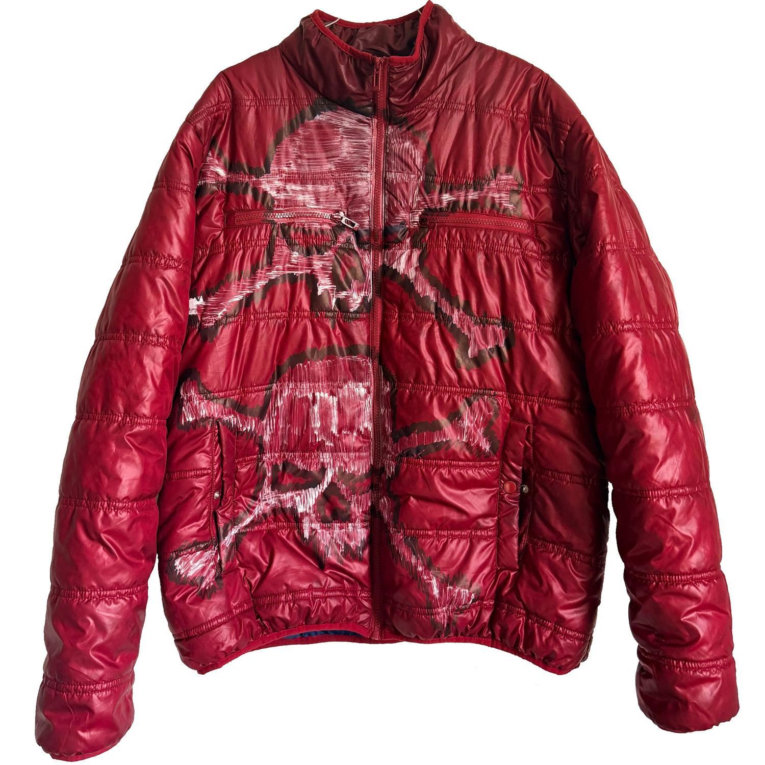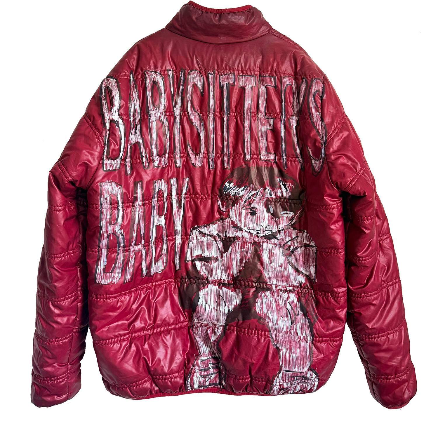 NAME: BABYSITTER'S BABY PUFFER SIZE: XL FIT: Oversized FABRIC & MATERIALS: Nylon, goose DESIGN DETAILS: Black and white alcohol based ink, the babysitter's baby and skulls STORY: For the kids who grew up in someone else’s arms. For the ones who learned comfort from a hired hug. For the after-school hours that felt longer than they should have. This piece is a quiet acknowledgment.