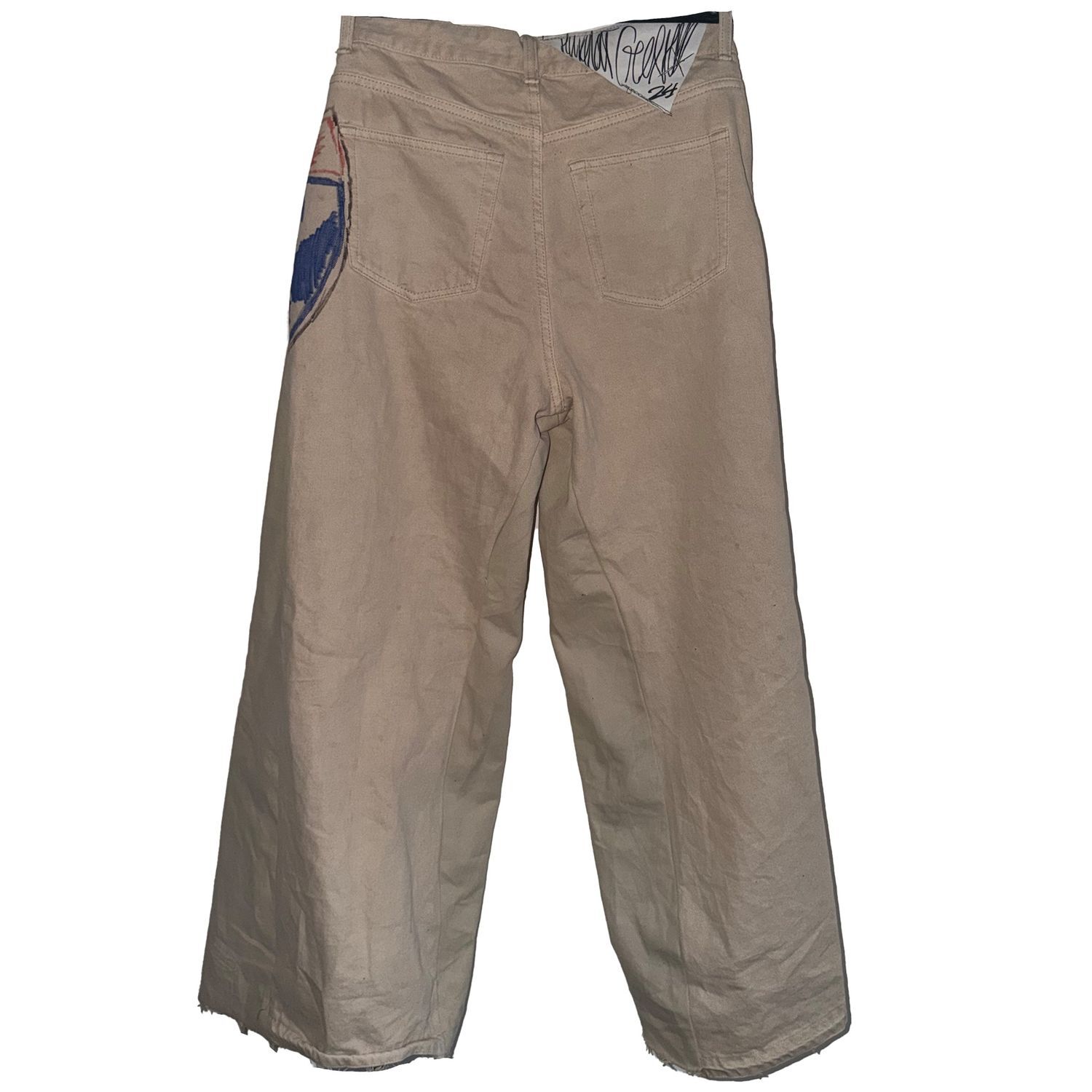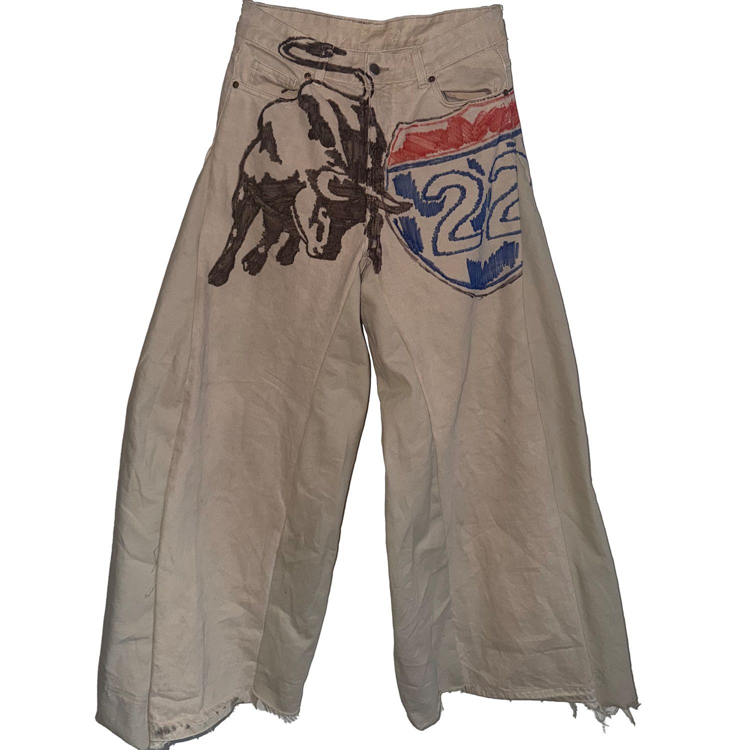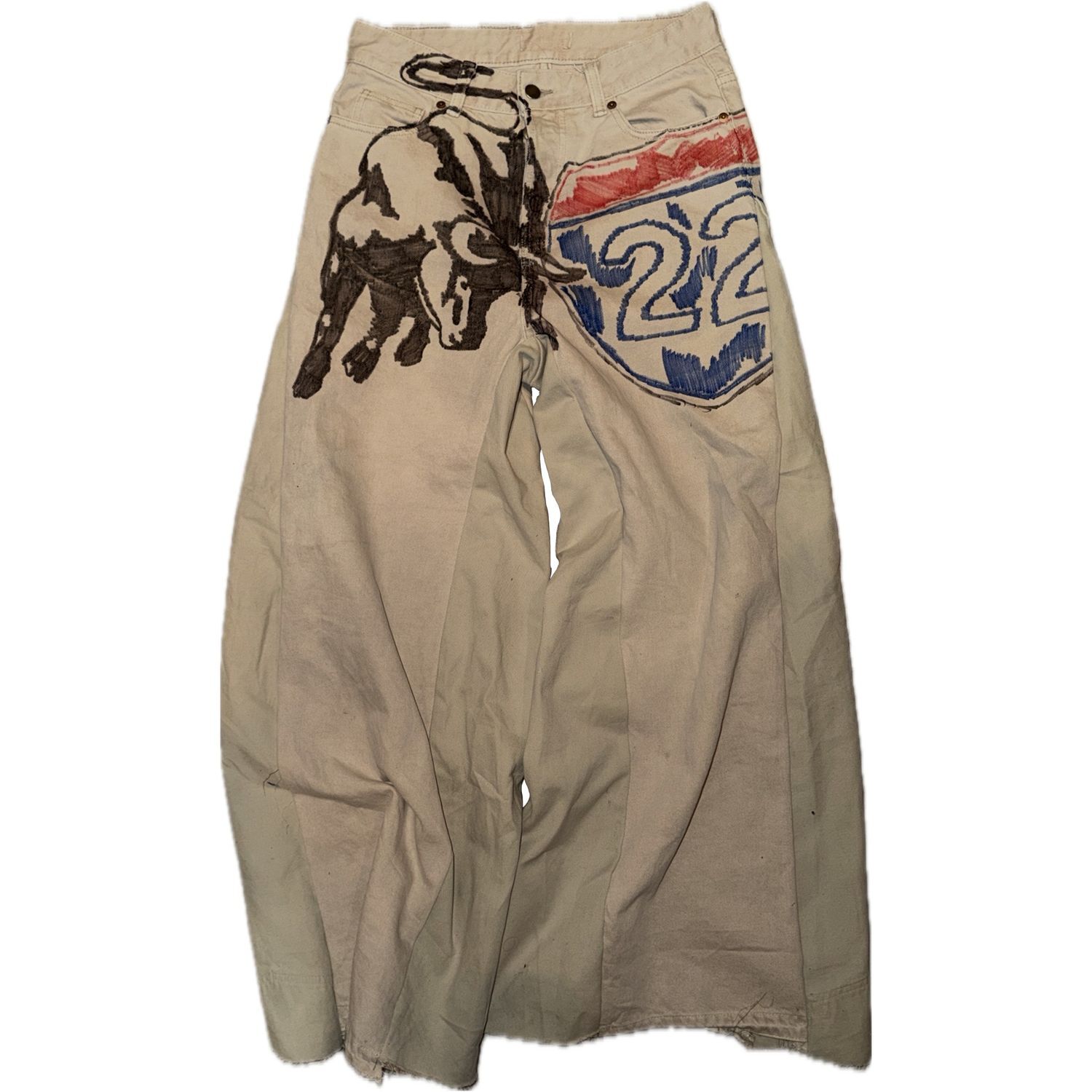 NAME: ROUTE22 DENIM SIZE: 31x34 FIT: Baggy low rise or high rise, depending on how you wear it FABRIC & MATERIALS: 100% Cotton DESIGN DETAILS: Bull clashing with a California Route 22 Sign, Duoflare