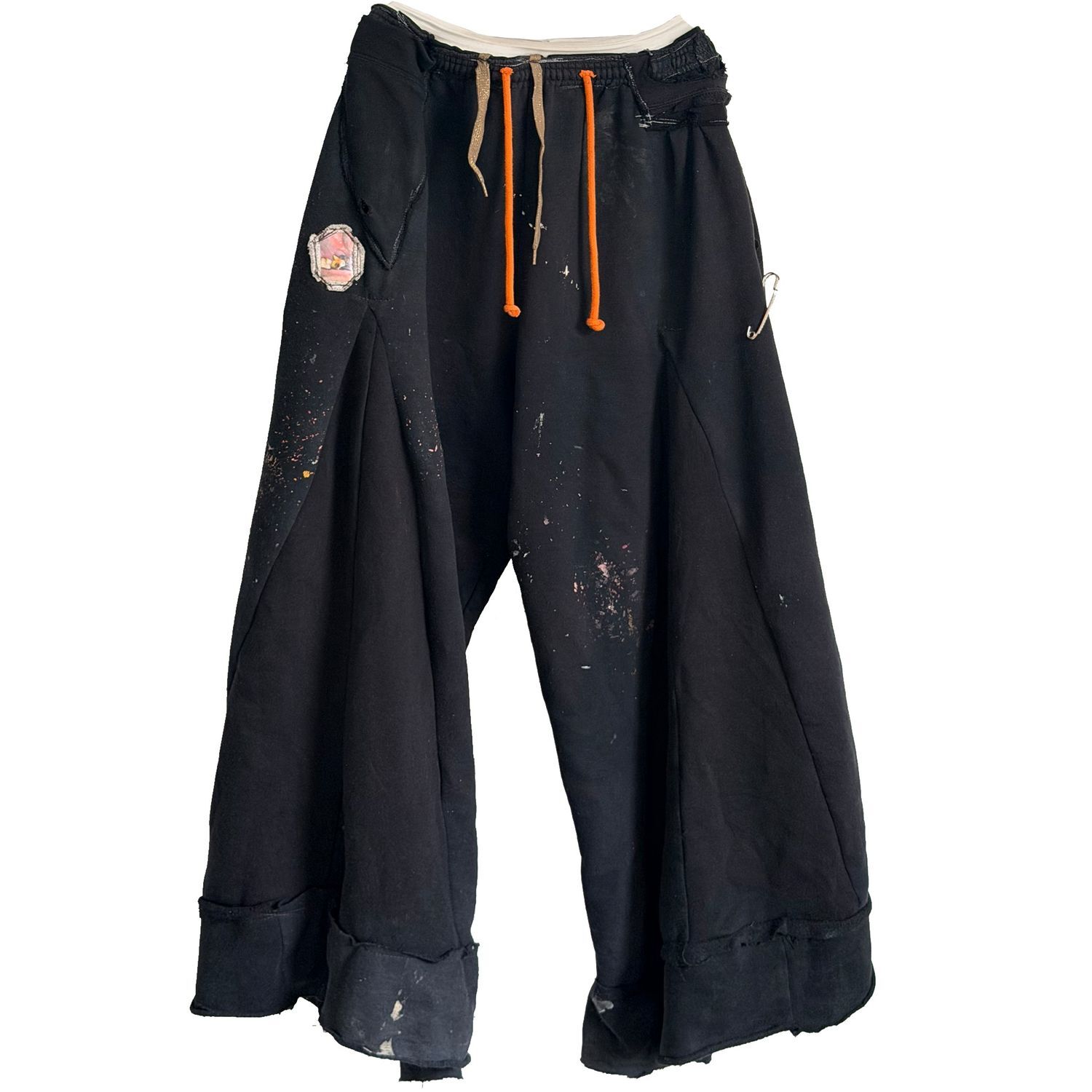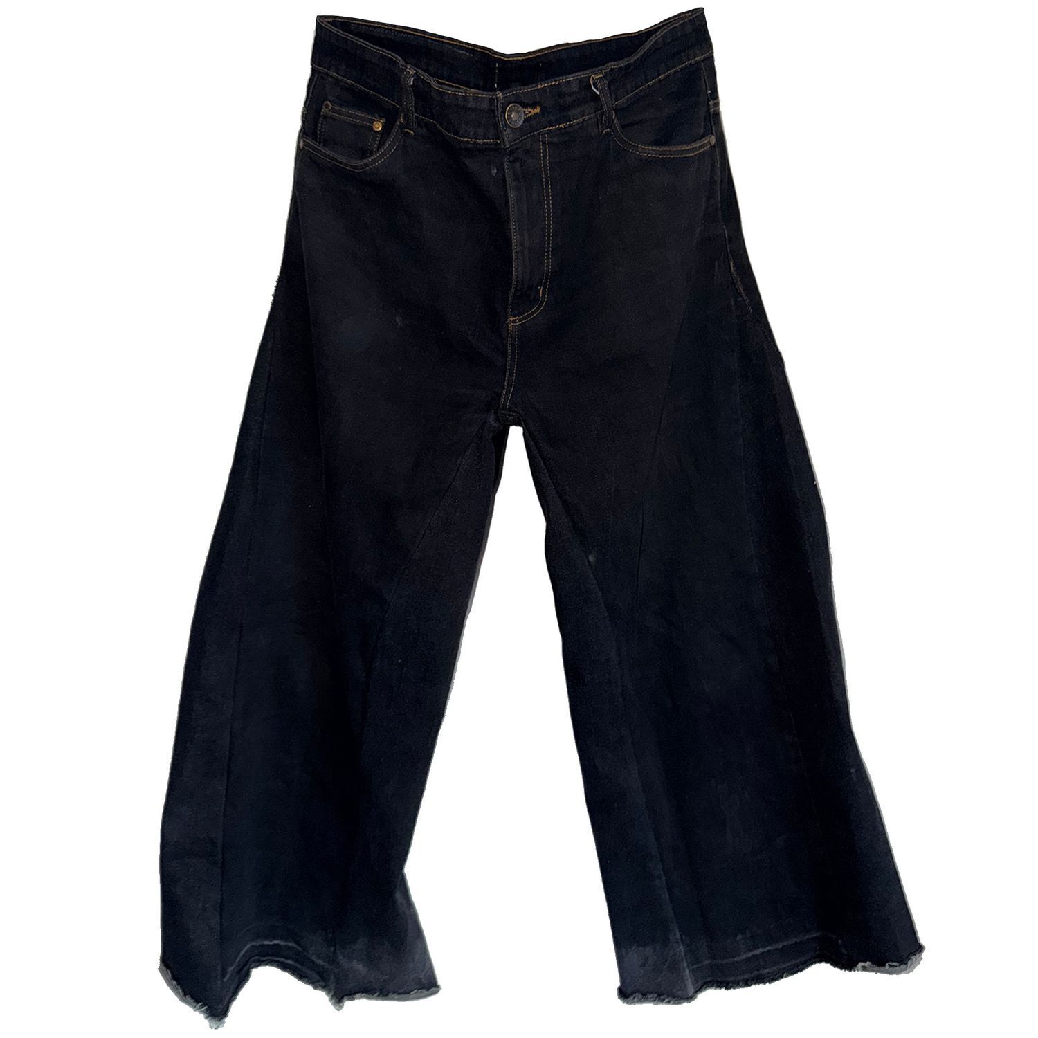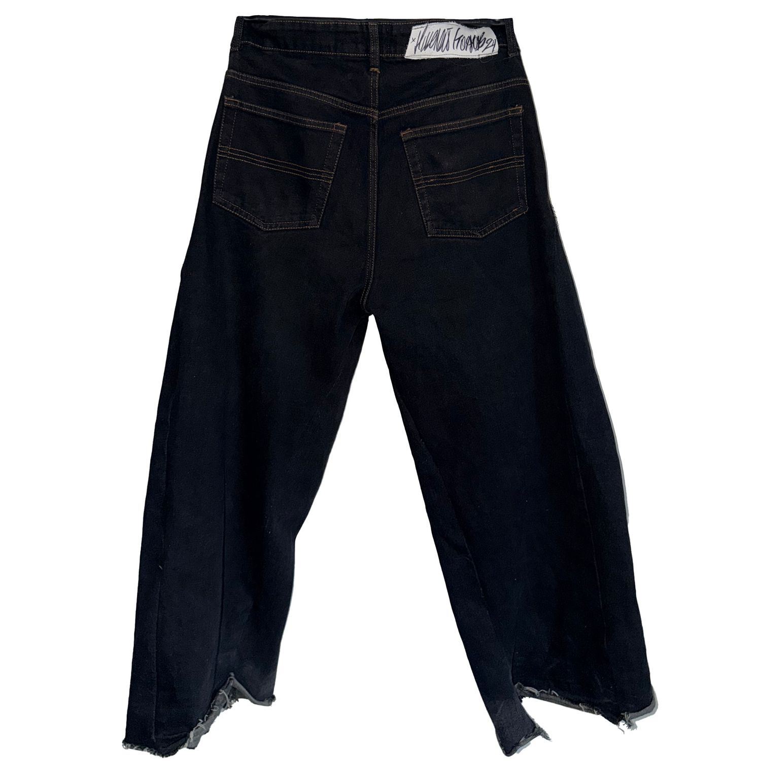 NAME: BLACK GO-TO DENIM; a beautiful classic, crafted with love SIZE: 34x34 FIT: Baggy fit FABRIC & MATERIALS: 100% Cotton DESIGN DETAILS: Duoflared, hand dyed